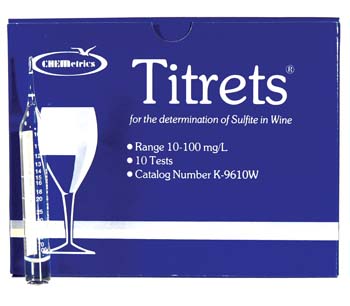 SO2 Titrets Checking free SO2 levels in wine is critical for succes. Free SO2 levels will protect wine from oxygenation and micro-organisms. This kit will provide ten tests. Simple to use, instructions included. Box contains 10 ampules. $18.95